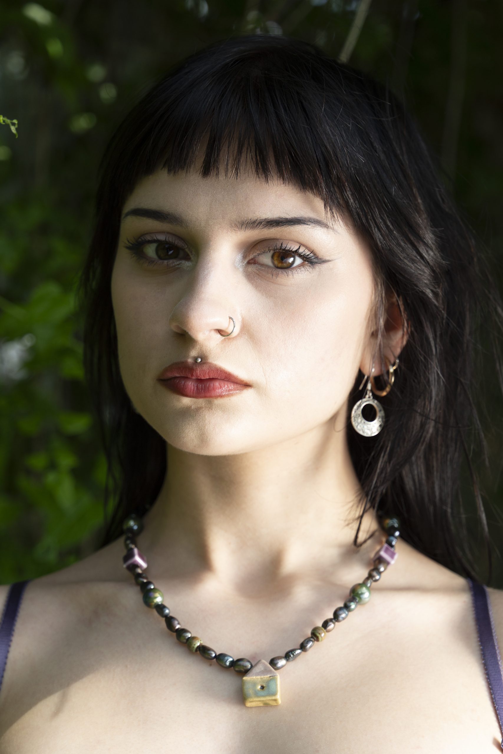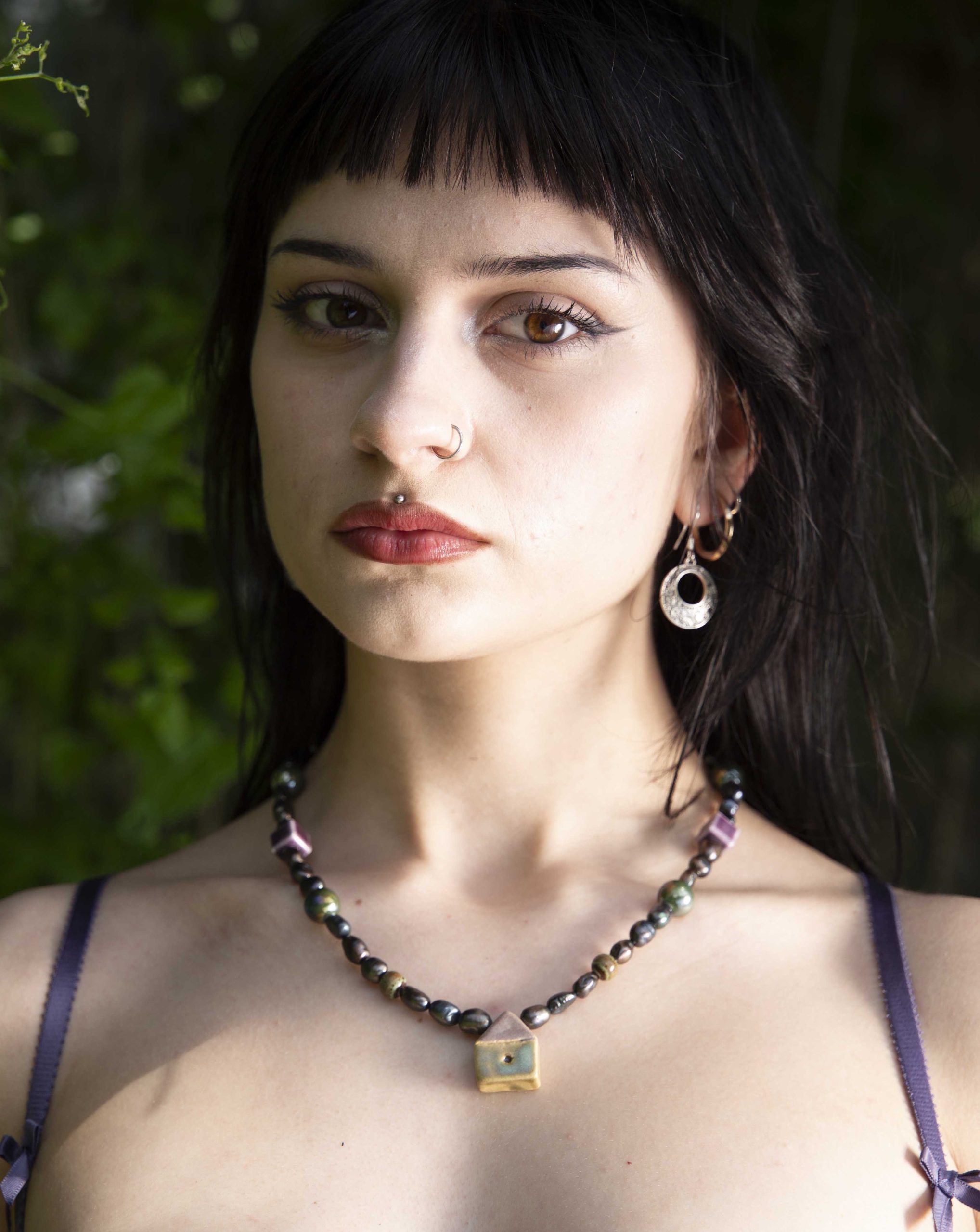 Naszyjnik z ręcznie wykonaną ceramiczną zawieszką, stworzoną w ramach collabu z Martą Shurpakovą. Pozostałe ceramiczne elementy zostały starannie dobrane do refleksów szkliwa na domku oraz do użytej tu naturalnej perły o czarnej barwie z fioletowo-zielonym połyskiem. Egzemplarz ten jest unikatowy i niepowtarzalny, ponieważ zawieszki powstawały ręcznie specjalnie na potrzeby tego projektu. Naszyjnik został wykonany na lince stalowej i wykończony zapięciem ze stali chirurgicznej.